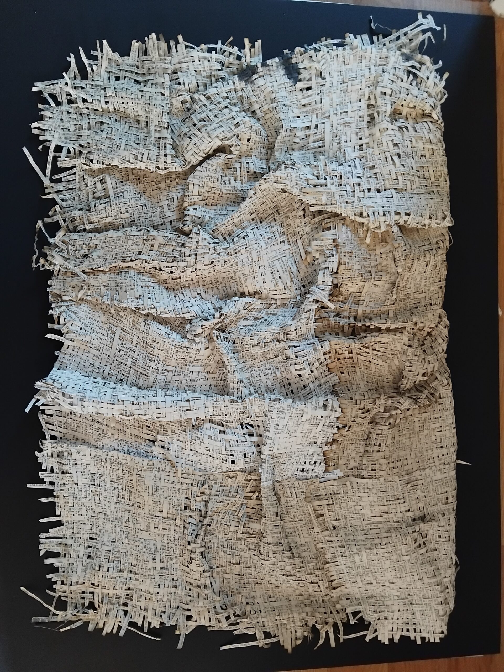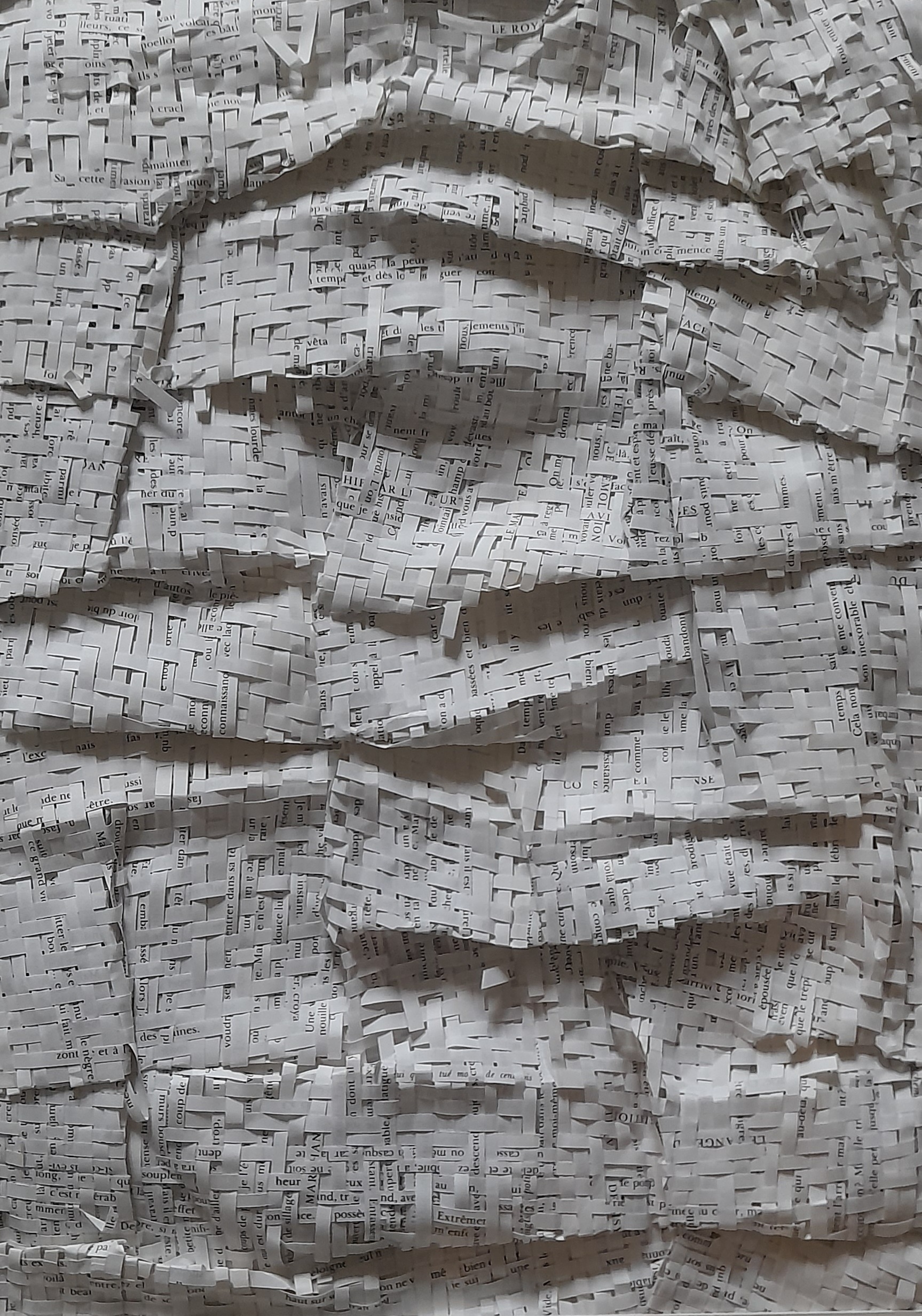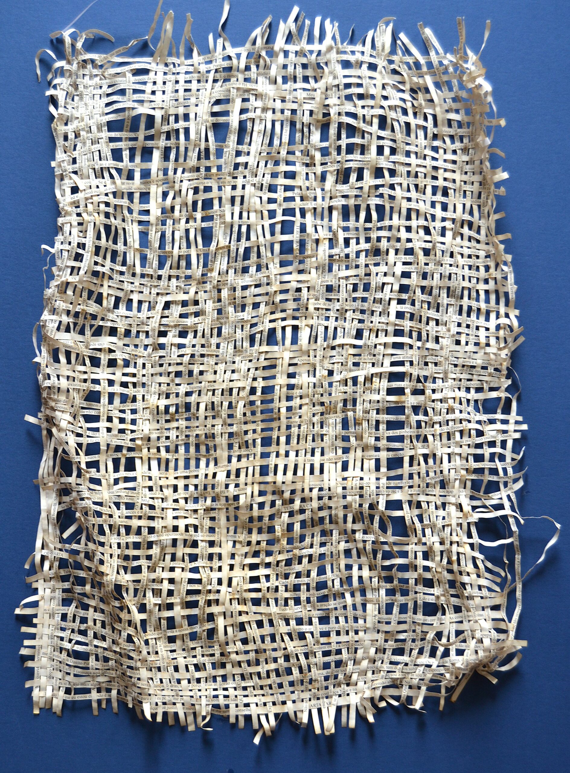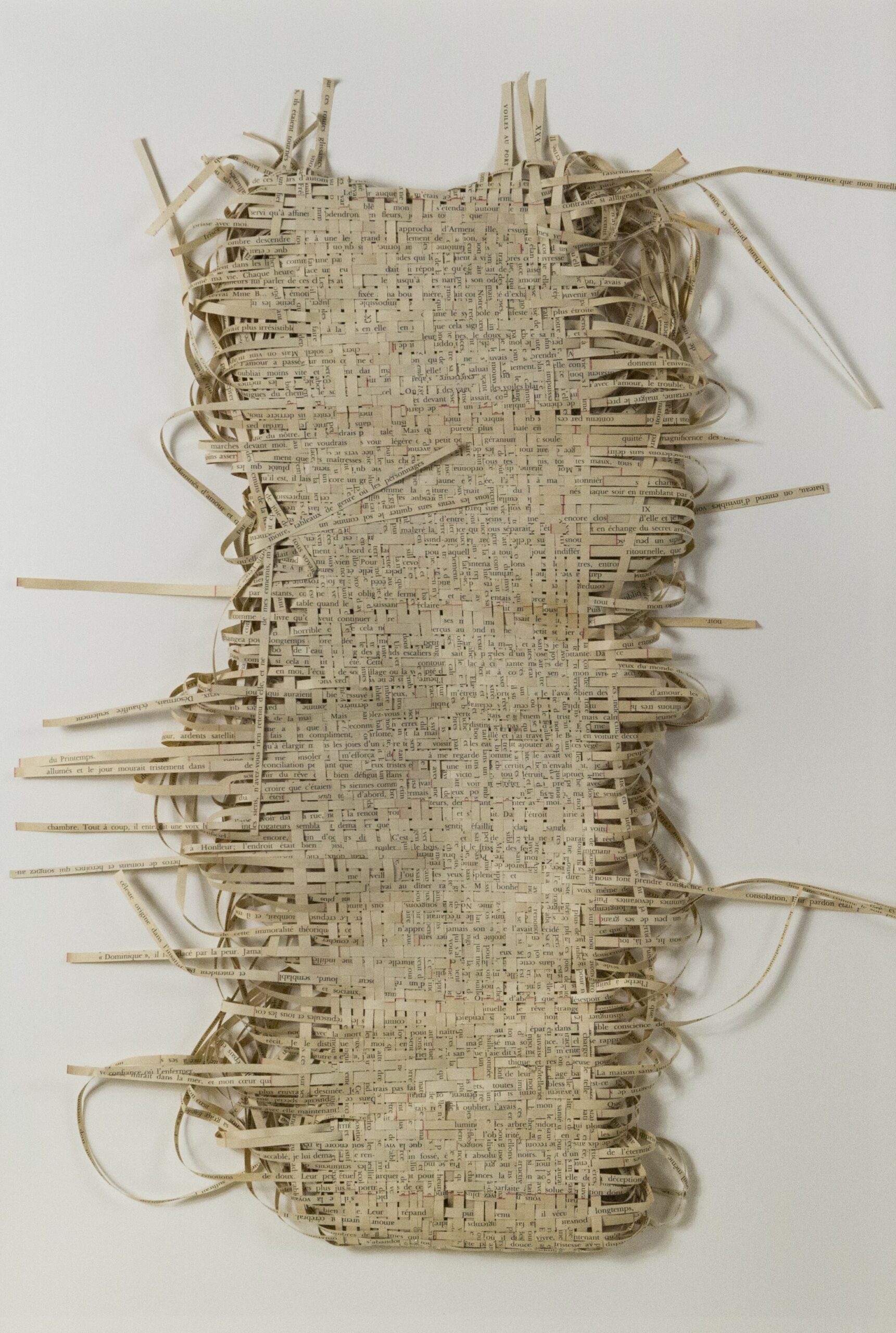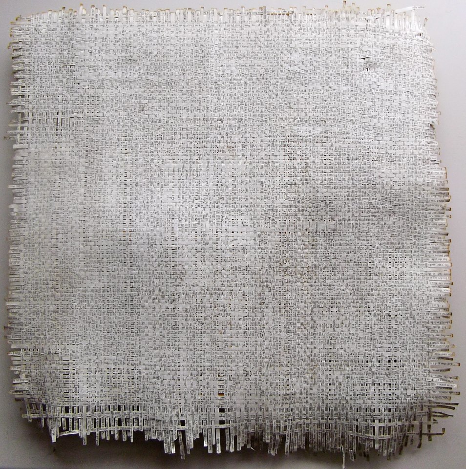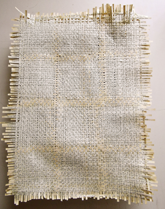 Textes littéraires tissés intégralement dans la langue d’origine. C’est la question de l’infini du livre, le paysage sans fin de la fiction. L’imaginaire est un territoire sans limites. Ce projet de monument de Babel » vise à donner une perception d’un océan de fictions. A l’image de La bibliothèque de Babel, une fois tissé ce sont des textes que l’on peut voir, que l’on peut sentir. Le livre donne une image. Il est traduit dans une langue qui n’est pas la sienne, celle de l’art visuel, de l’art textile. C’est un travail sans fin, un travail de Pénélope donnant corps aux livres. Il y a dans le processus de tissage la création d’un labyrinthe. Chaque livre est traduit en textile dans son intégralité, sa langue d’origine à la main. Depuis 2011, Ilann Vogt travaille à la métamorphose de la fiction, se perd dans les livres. A ce jour près de 400 textes furent tissés. Les livres font de ce projet une bibliothèque en perpétuelle augmentation.