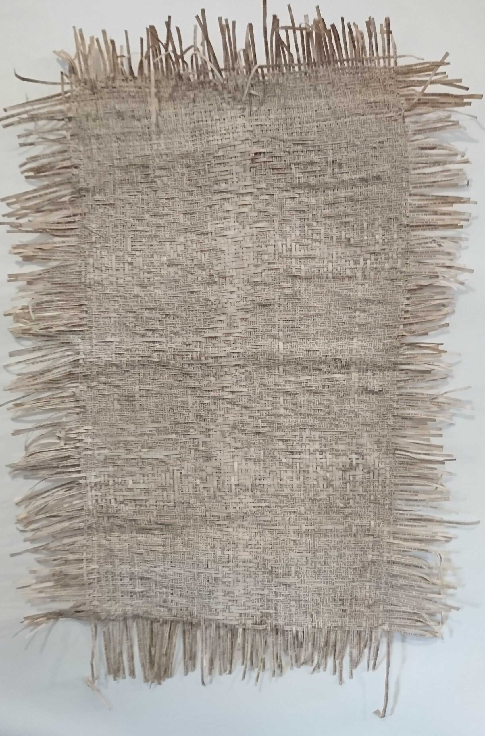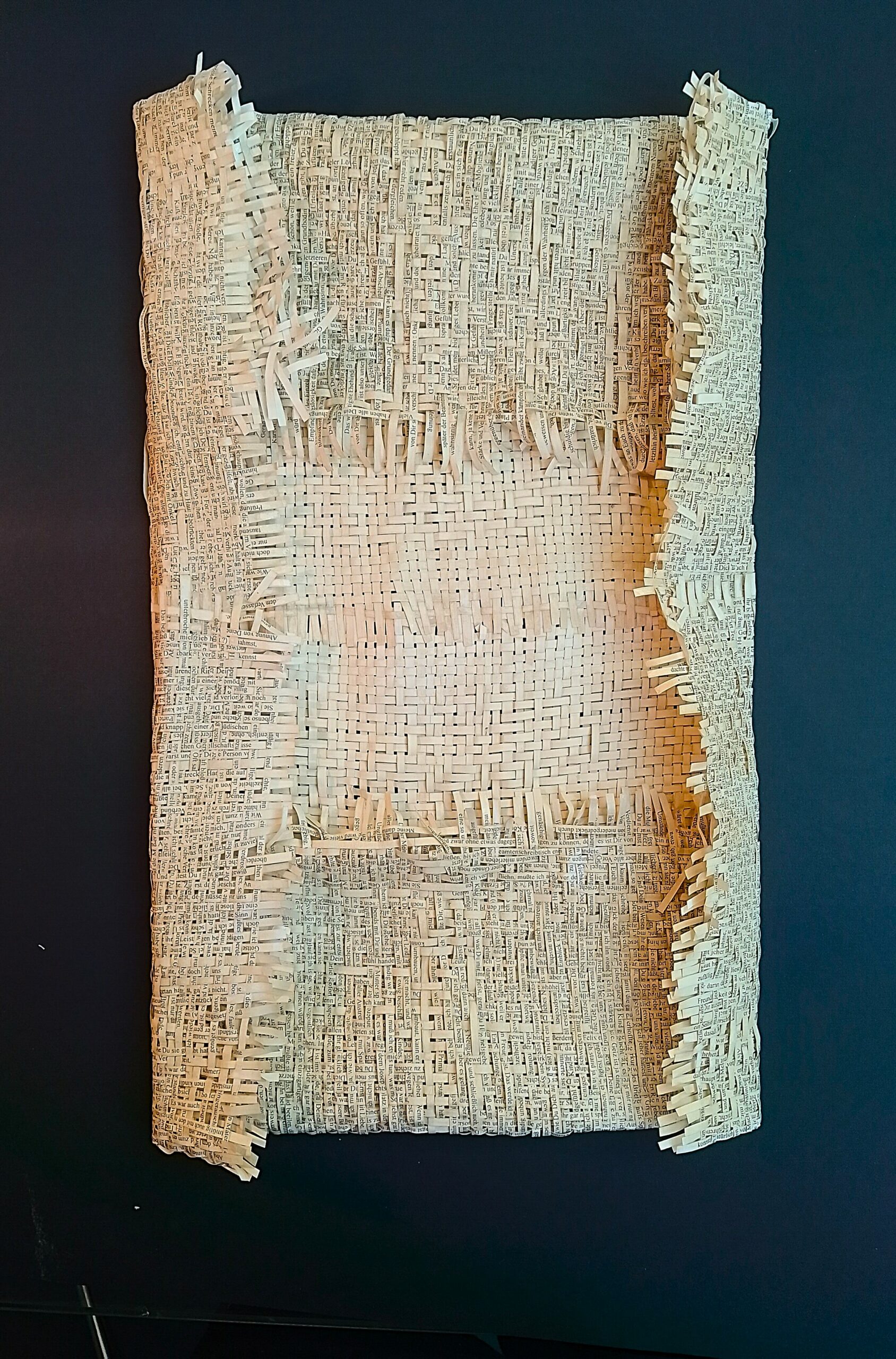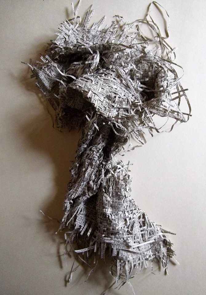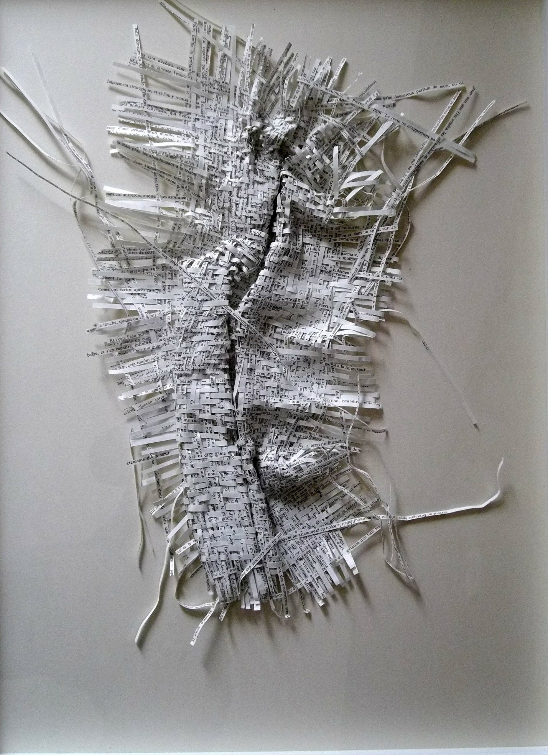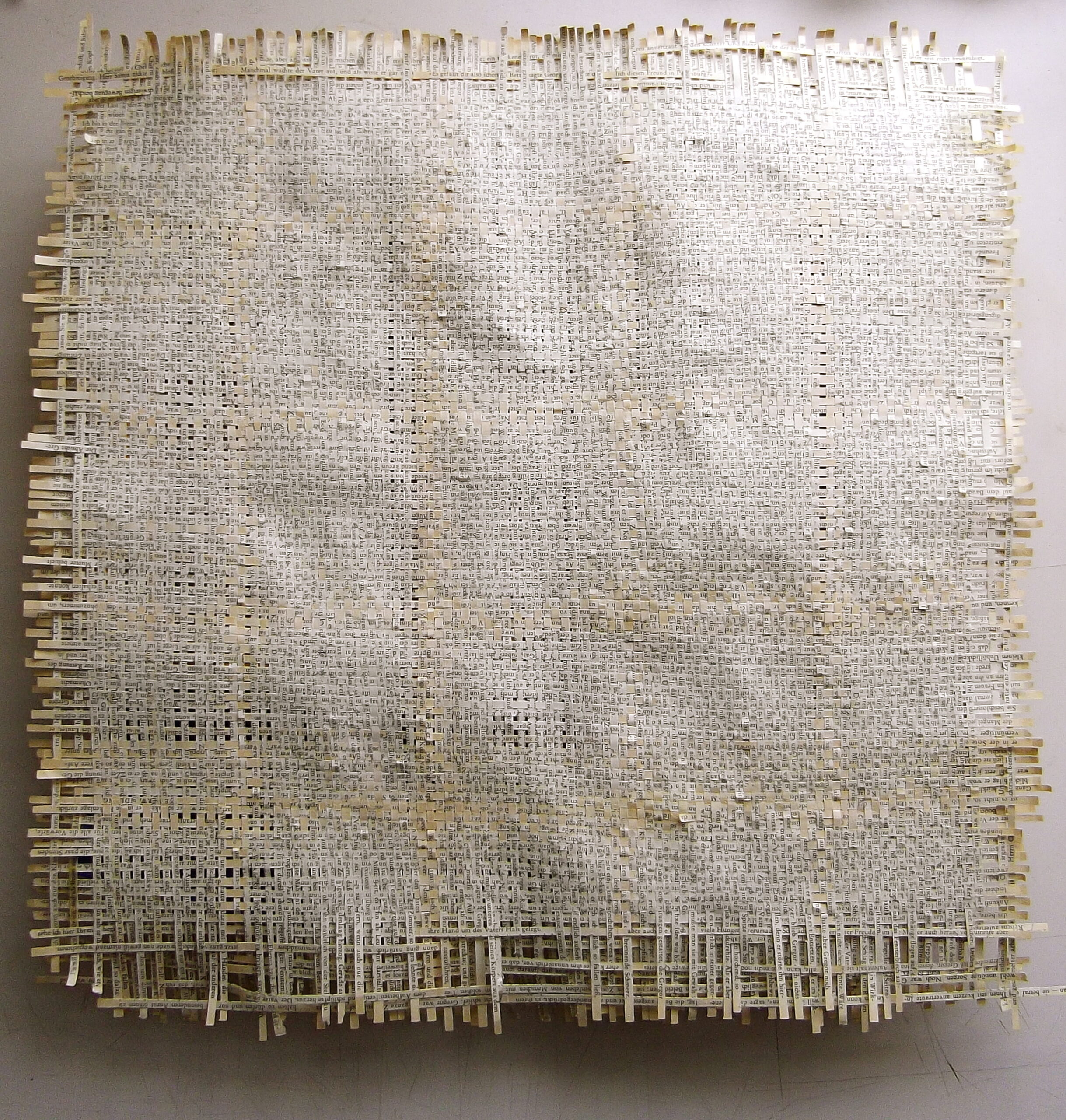 Textes littéraires tissés intégralement dans la langue d’origine. C’est la question de l’infini du livre, le paysage sans fin de la fiction. L’imaginaire est un territoire sans limites. Ce projet de monument de Babel » vise à donner une perception d’un océan de fictions. A l’image de La bibliothèque de Babel, une fois tissé ce sont des textes que l’on peut voir, que l’on peut sentir. Le livre donne une image. Il est traduit dans une langue qui n’est pas la sienne, celle de l’art visuel, de l’art textile. C’est un travail sans fin, un travail de Pénélope donnant corps aux livres. Il y a dans le processus de tissage la création d’un labyrinthe. Chaque livre est traduit en textile dans son intégralité, sa langue d’origine à la main. Depuis 2011, Ilann Vogt travaille à la métamorphose de la fiction, se perd dans les livres. A ce jour près de 400 textes furent tissés. Les livres font de ce projet une bibliothèque en perpétuelle augmentation.