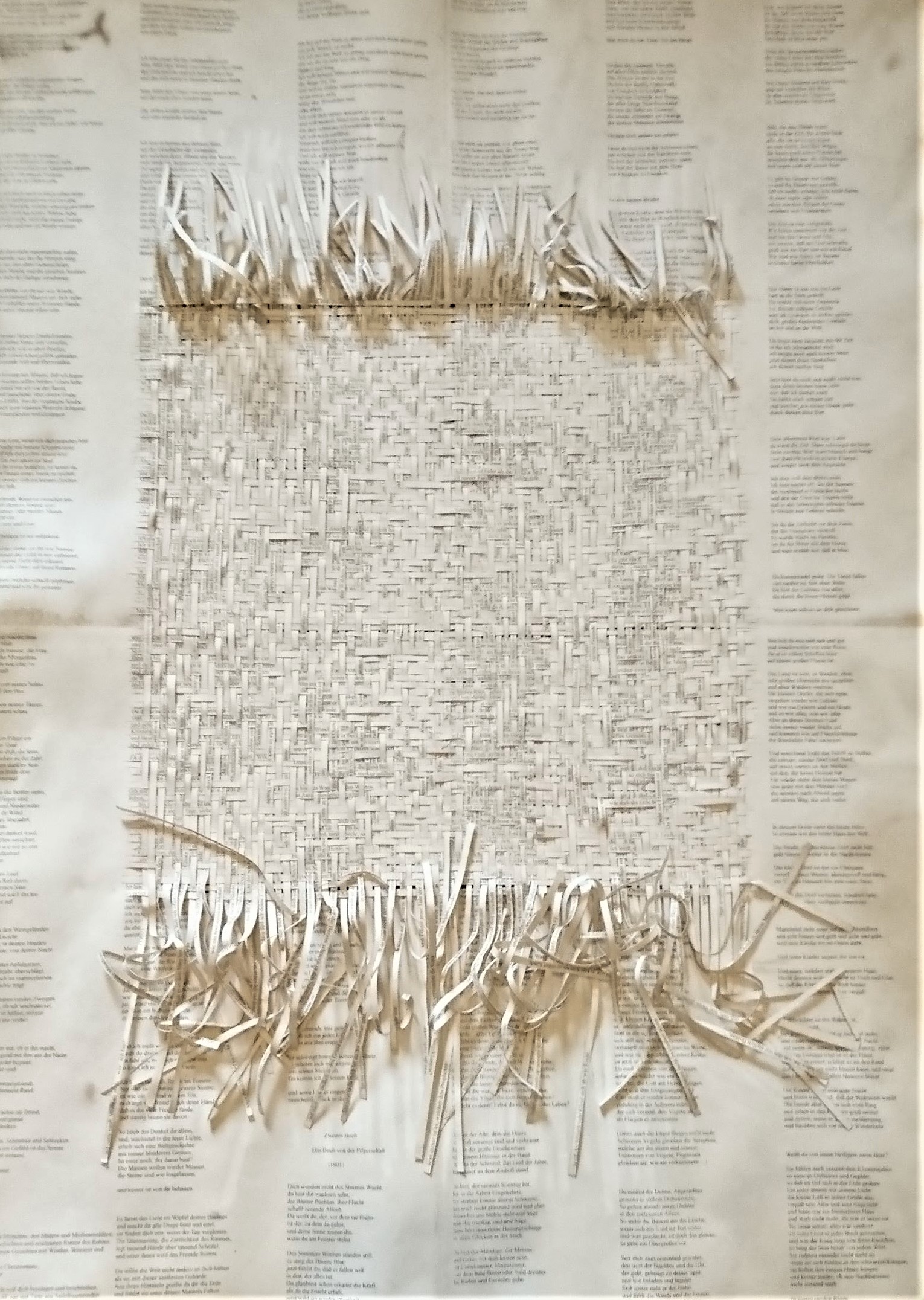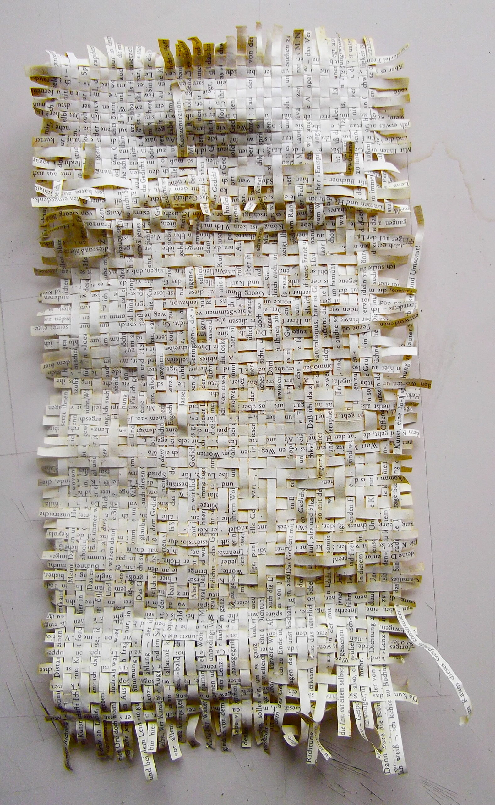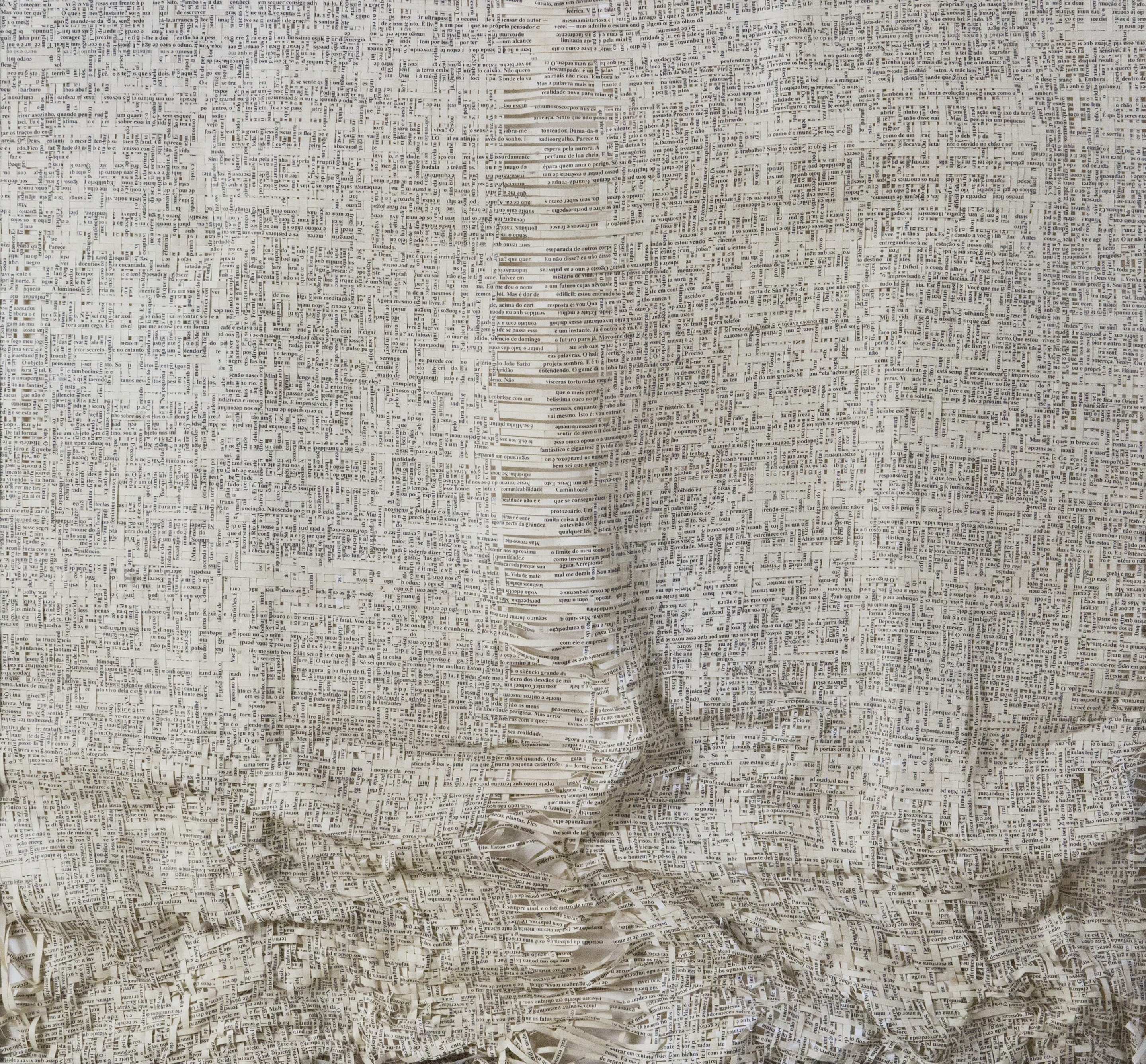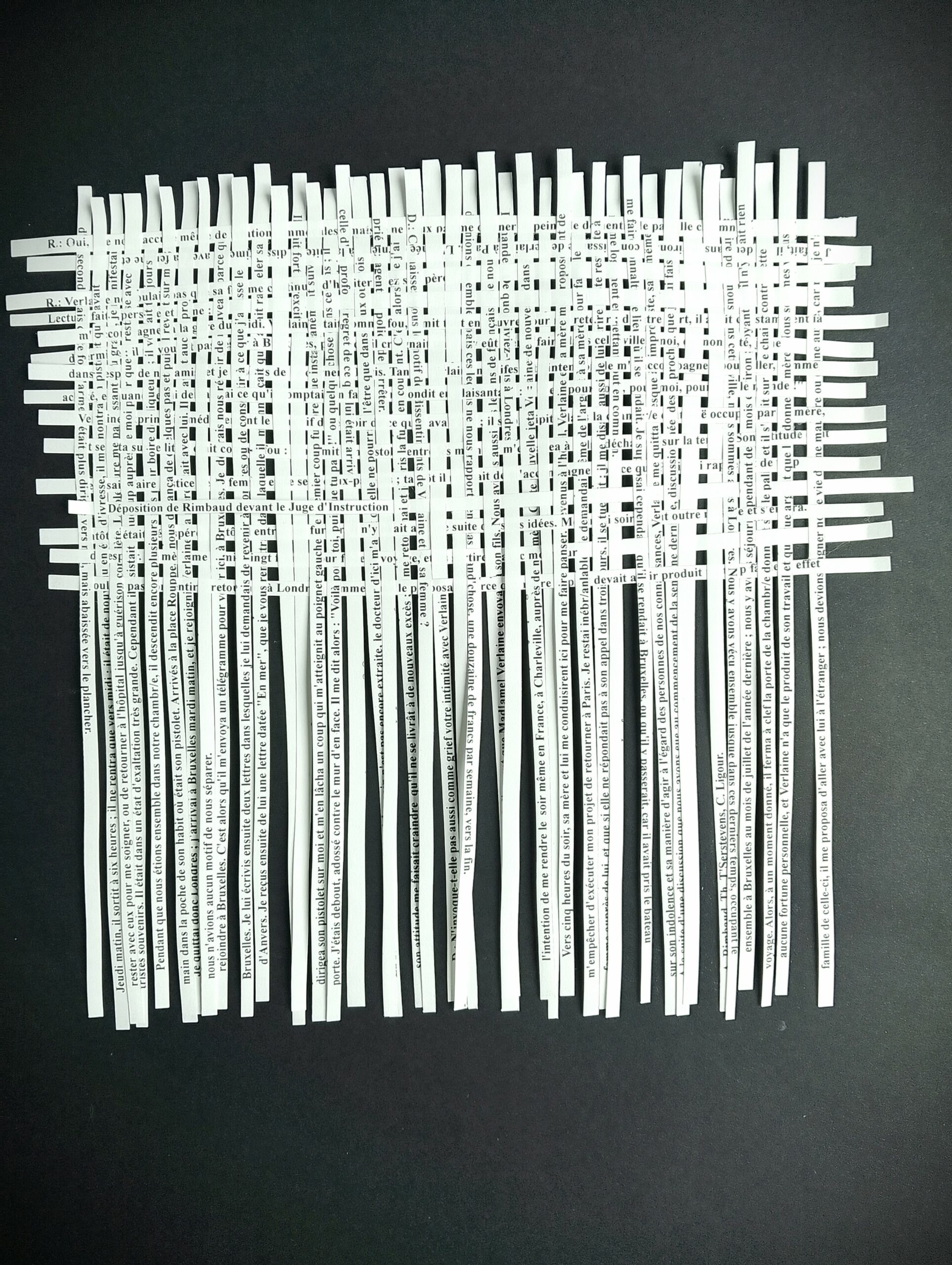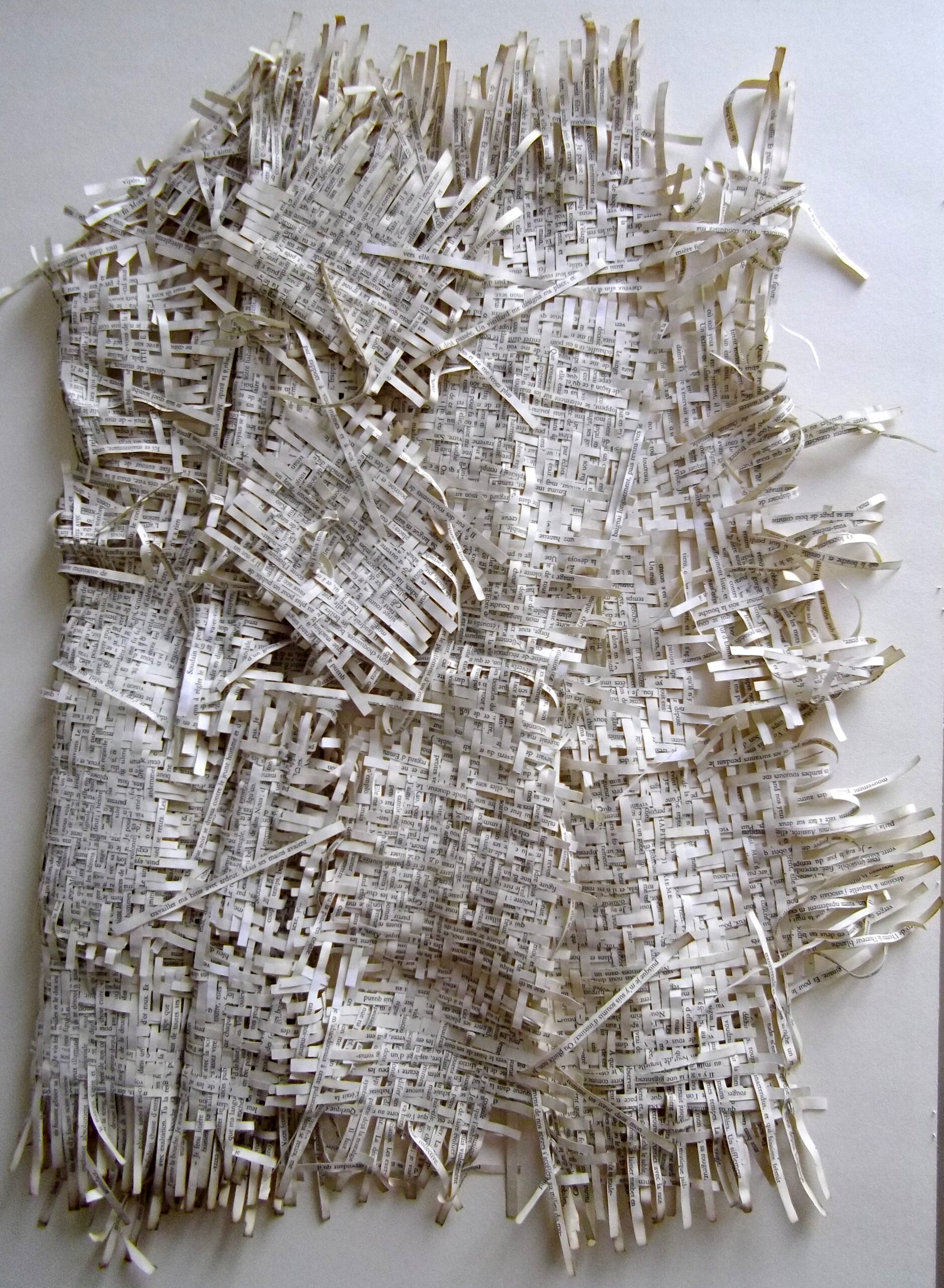 Textes littéraires tissés intégralement dans la langue d’origine. C’est la question de l’infini du livre, le paysage sans fin de la fiction. L’imaginaire est un territoire sans limites. Ce projet de monument de Babel » vise à donner une perception d’un océan de fictions. A l’image de La bibliothèque de Babel, une fois tissé ce sont des textes que l’on peut voir, que l’on peut sentir. Le livre donne une image. Il est traduit dans une langue qui n’est pas la sienne, celle de l’art visuel, de l’art textile. C’est un travail sans fin, un travail de Pénélope donnant corps aux livres. Il y a dans le processus de tissage la création d’un labyrinthe. Chaque livre est traduit en textile dans son intégralité, sa langue d’origine à la main. Depuis 2011, Ilann Vogt travaille à la métamorphose de la fiction, se perd dans les livres. A ce jour près de 400 textes furent tissés. Les livres font de ce projet une bibliothèque en perpétuelle augmentation.