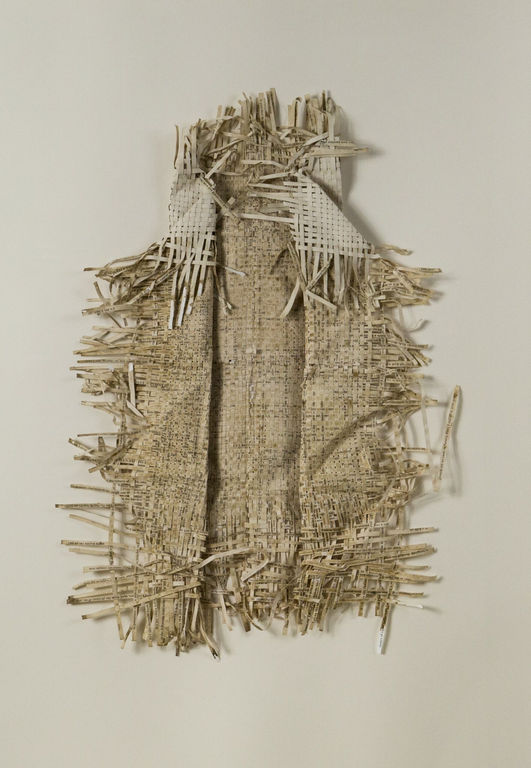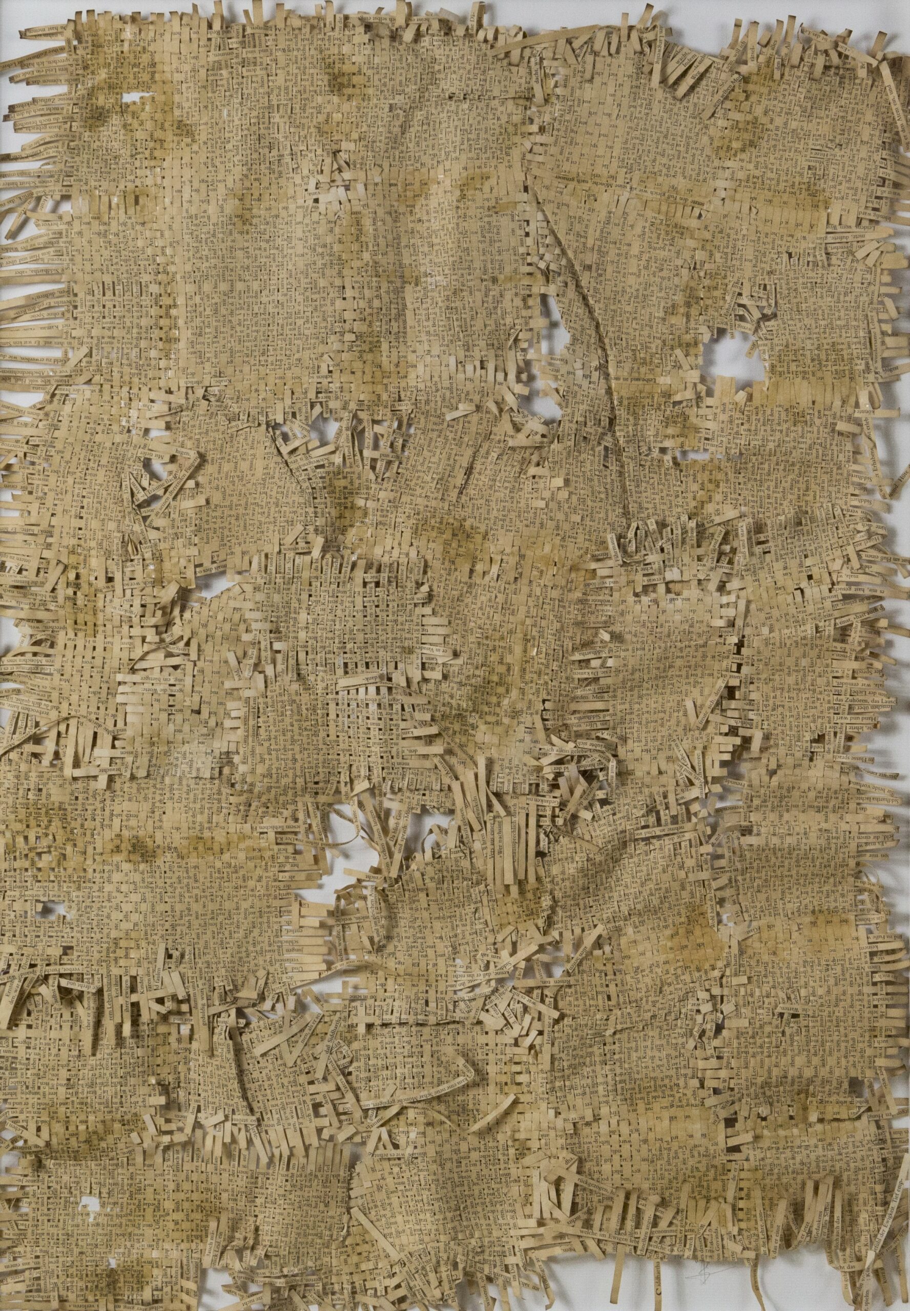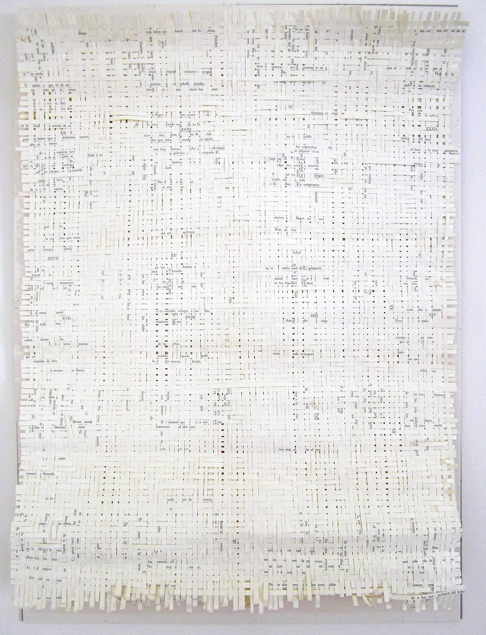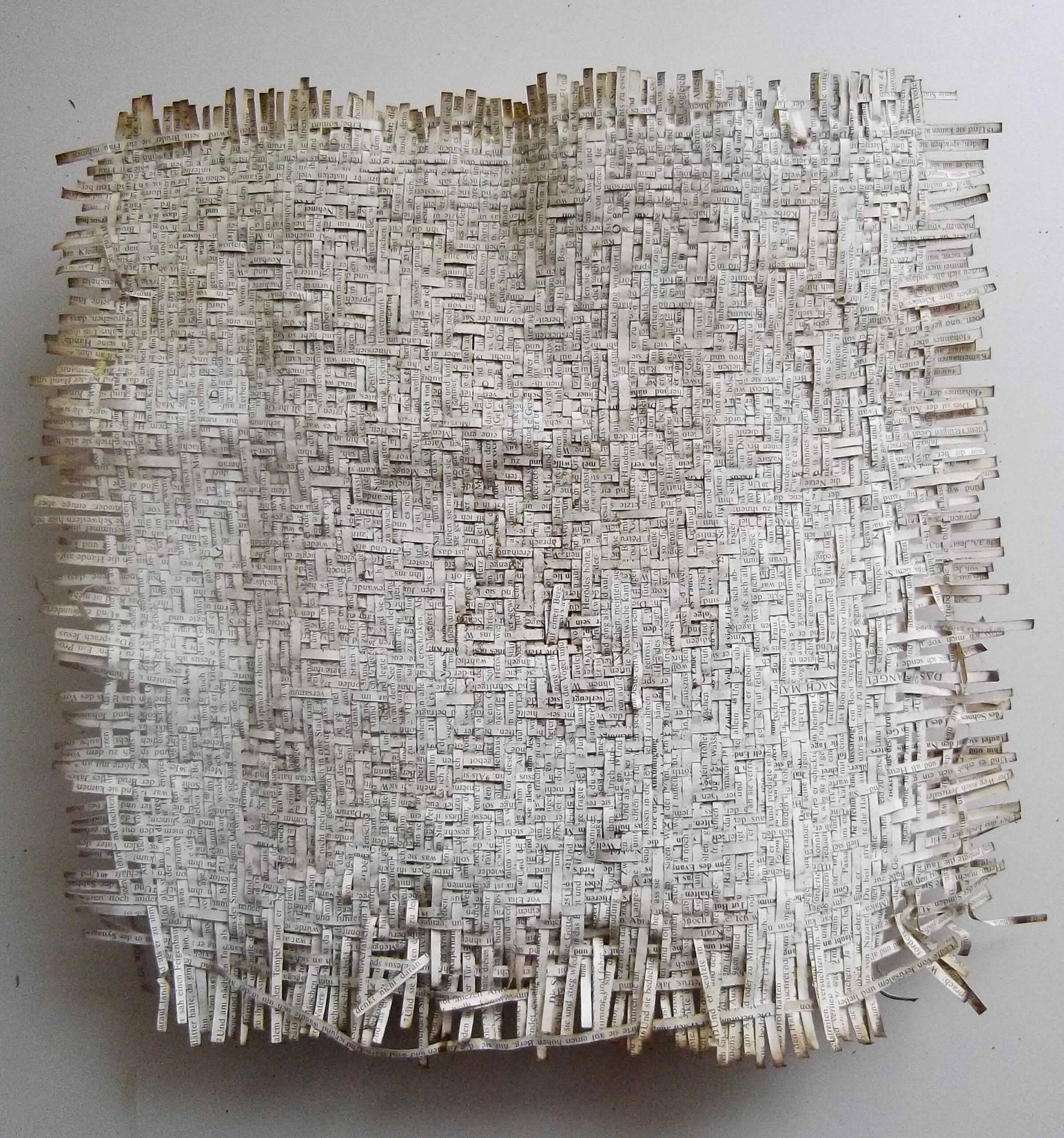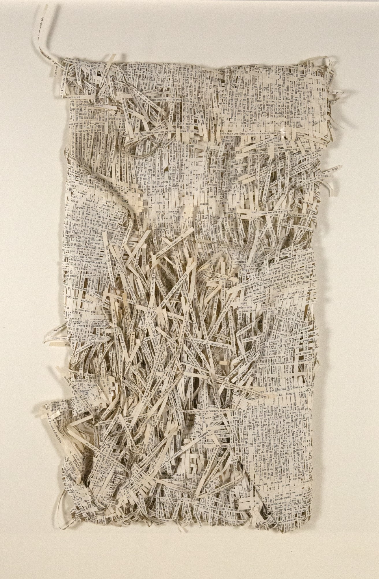 Textes littéraires tissés intégralement dans la langue d’origine. C’est la question de l’infini du livre, le paysage sans fin de la fiction. L’imaginaire est un territoire sans limites. Ce projet de monument de Babel » vise à donner une perception d’un océan de fictions. A l’image de La bibliothèque de Babel, une fois tissé ce sont des textes que l’on peut voir, que l’on peut sentir. Le livre donne une image. Il est traduit dans une langue qui n’est pas la sienne, celle de l’art visuel, de l’art textile. C’est un travail sans fin, un travail de Pénélope donnant corps aux livres. Il y a dans le processus de tissage la création d’un labyrinthe. Chaque livre est traduit en textile dans son intégralité, sa langue d’origine à la main. Depuis 2011, Ilann Vogt travaille à la métamorphose de la fiction, se perd dans les livres. A ce jour près de 400 textes furent tissés. Les livres font de ce projet une bibliothèque en perpétuelle augmentation.