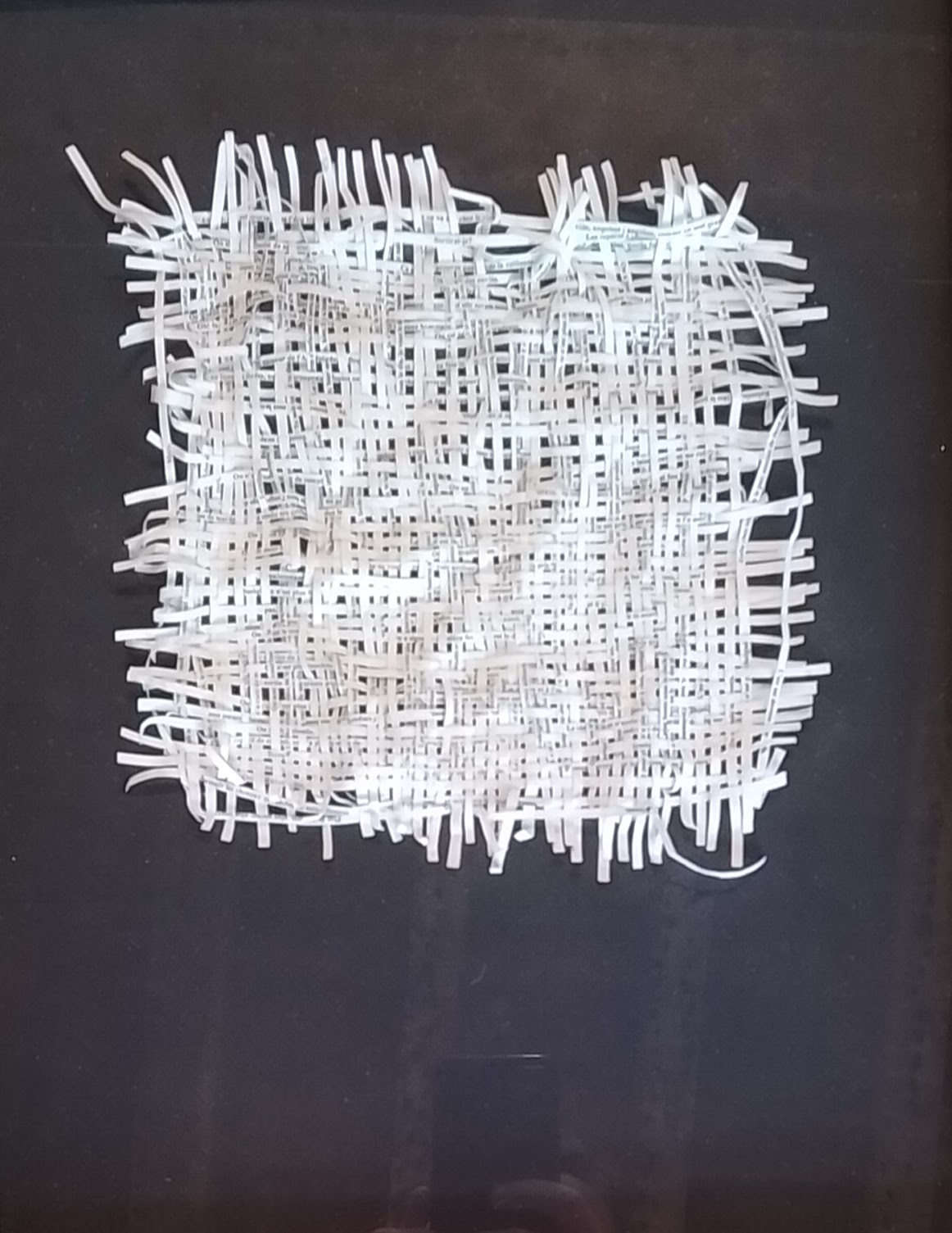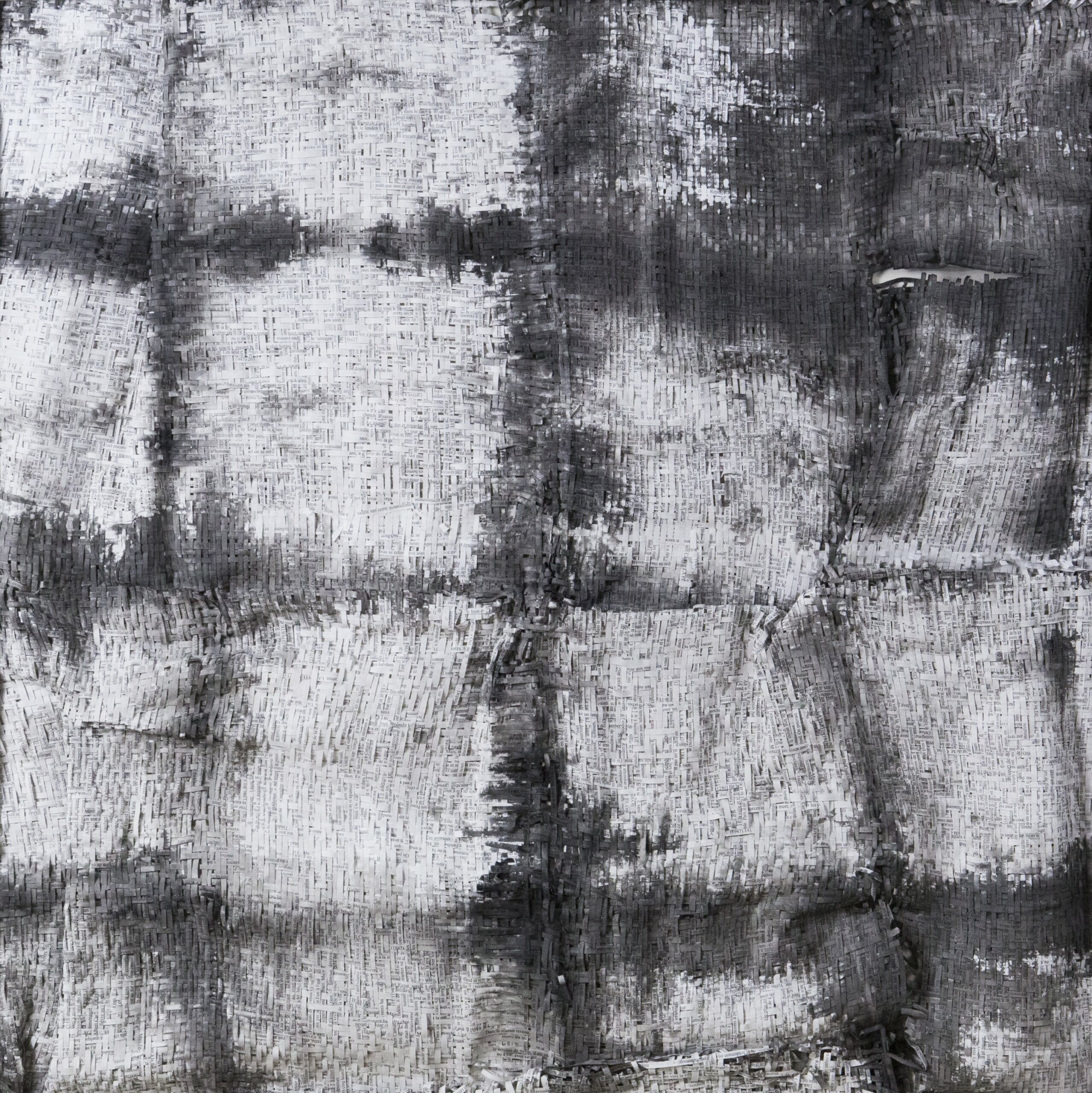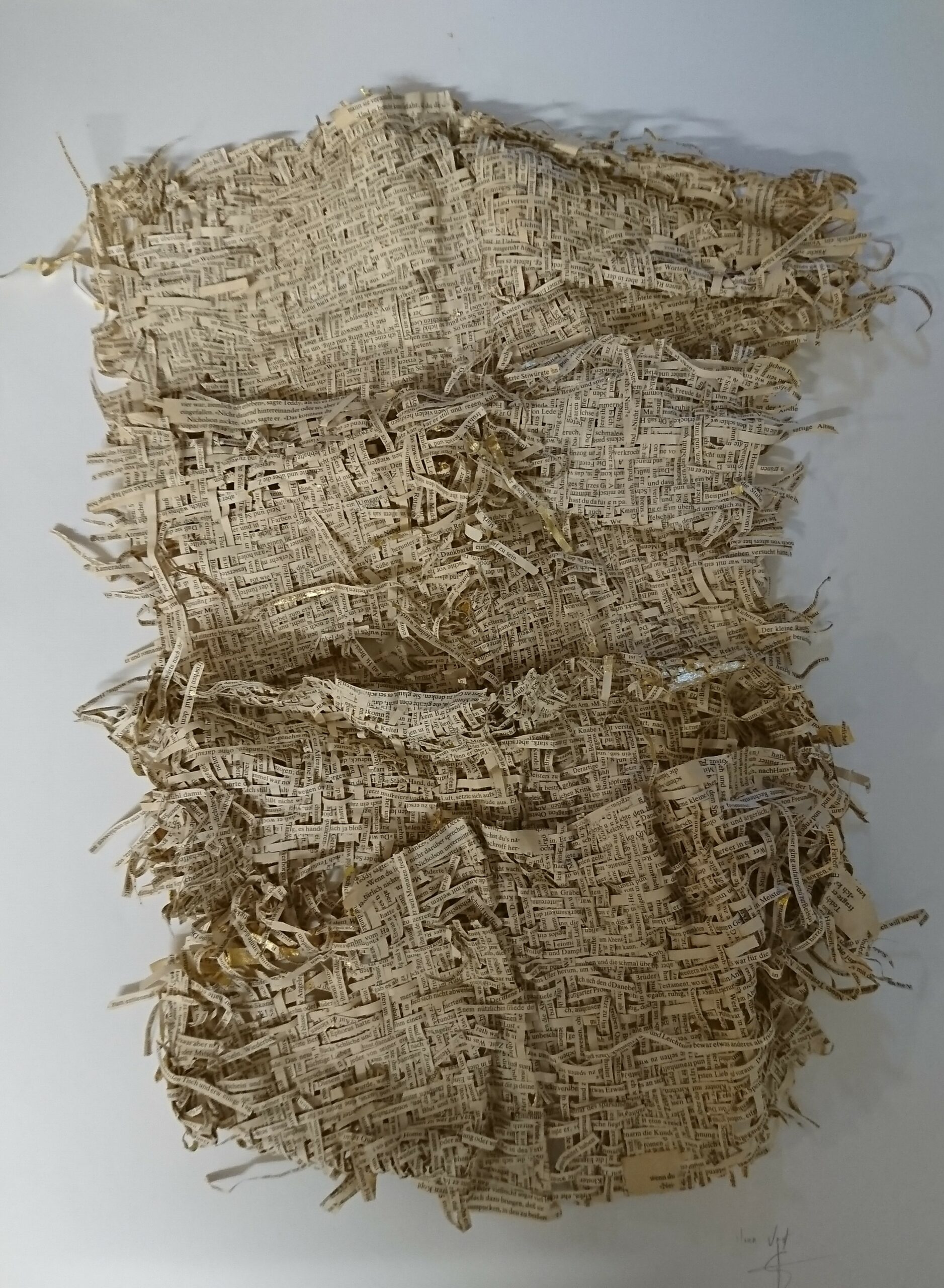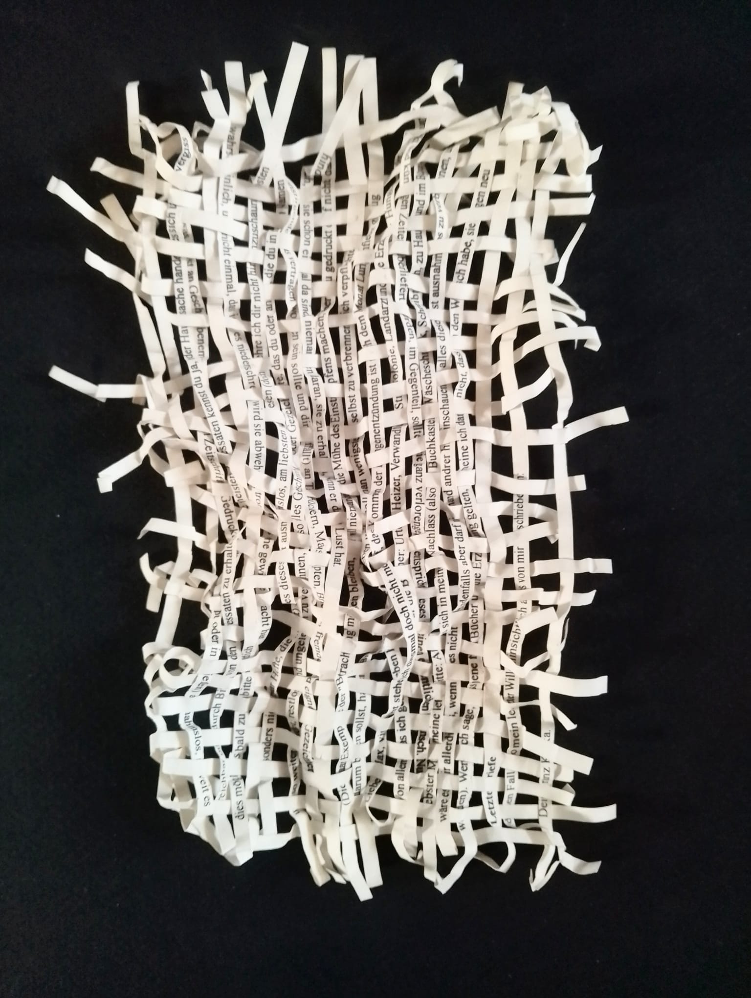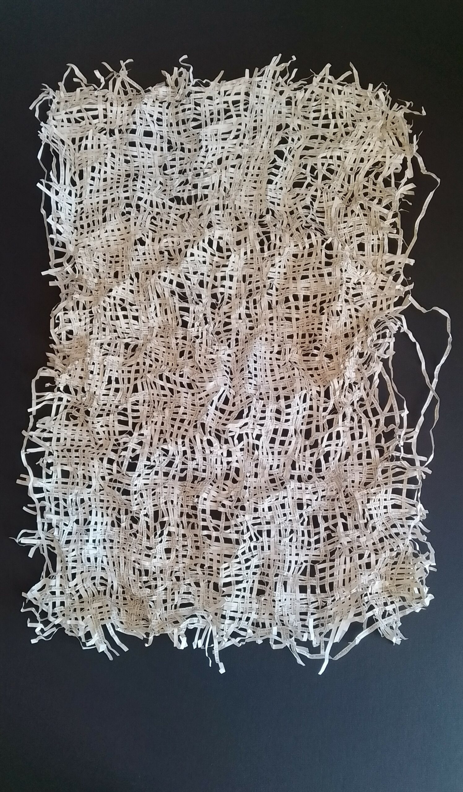 Textes littéraires tissés intégralement dans la langue d’origine. C’est la question de l’infini du livre, le paysage sans fin de la fiction. L’imaginaire est un territoire sans limites. Ce projet de monument de Babel » vise à donner une perception d’un océan de fictions. A l’image de La bibliothèque de Babel, une fois tissé ce sont des textes que l’on peut voir, que l’on peut sentir. Le livre donne une image. Il est traduit dans une langue qui n’est pas la sienne, celle de l’art visuel, de l’art textile. C’est un travail sans fin, un travail de Pénélope donnant corps aux livres. Il y a dans le processus de tissage la création d’un labyrinthe. Chaque livre est traduit en textile dans son intégralité, sa langue d’origine à la main. Depuis 2011, Ilann Vogt travaille à la métamorphose de la fiction, se perd dans les livres. A ce jour près de 400 textes furent tissés. Les livres font de ce projet une bibliothèque en perpétuelle augmentation.