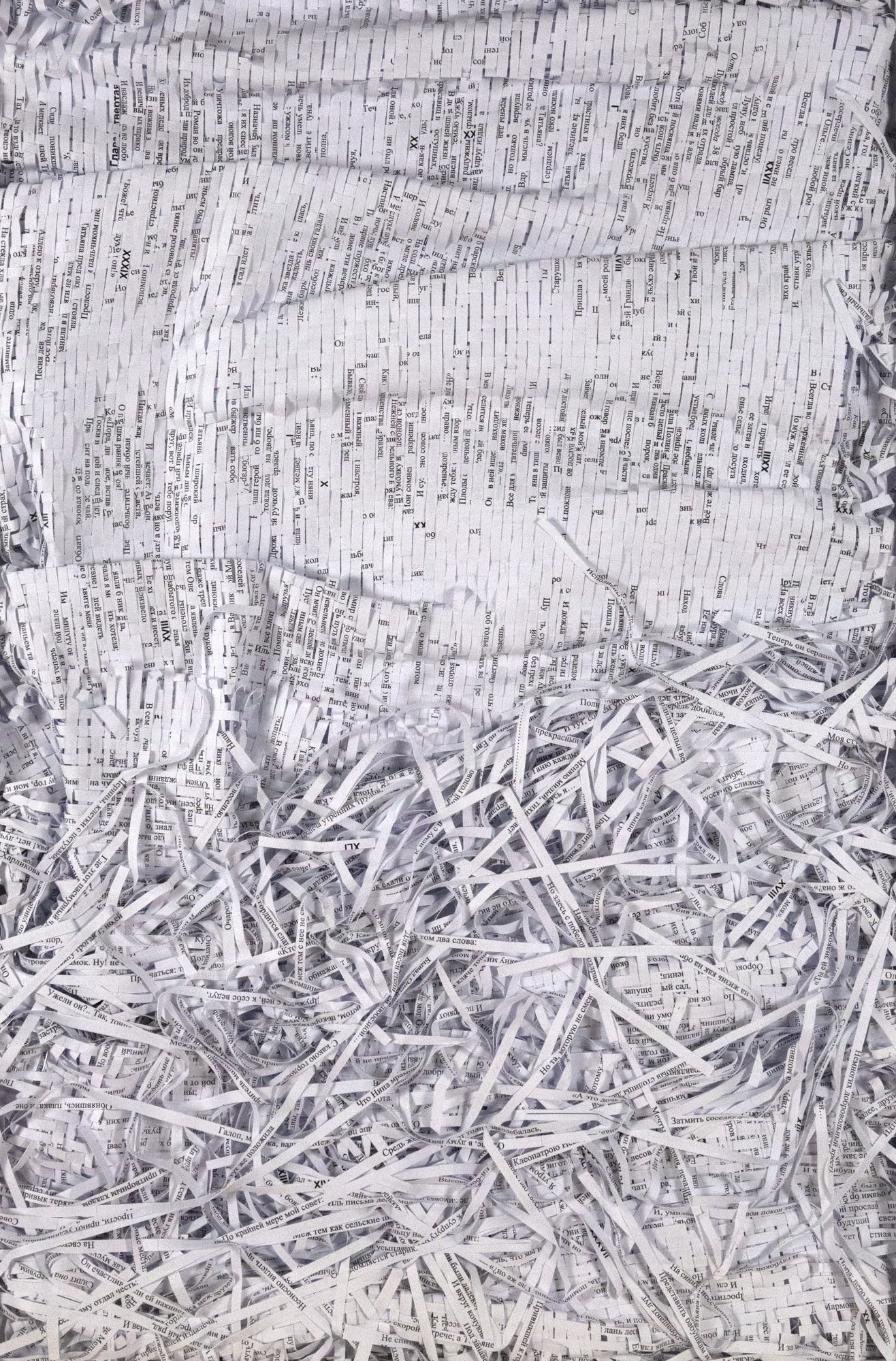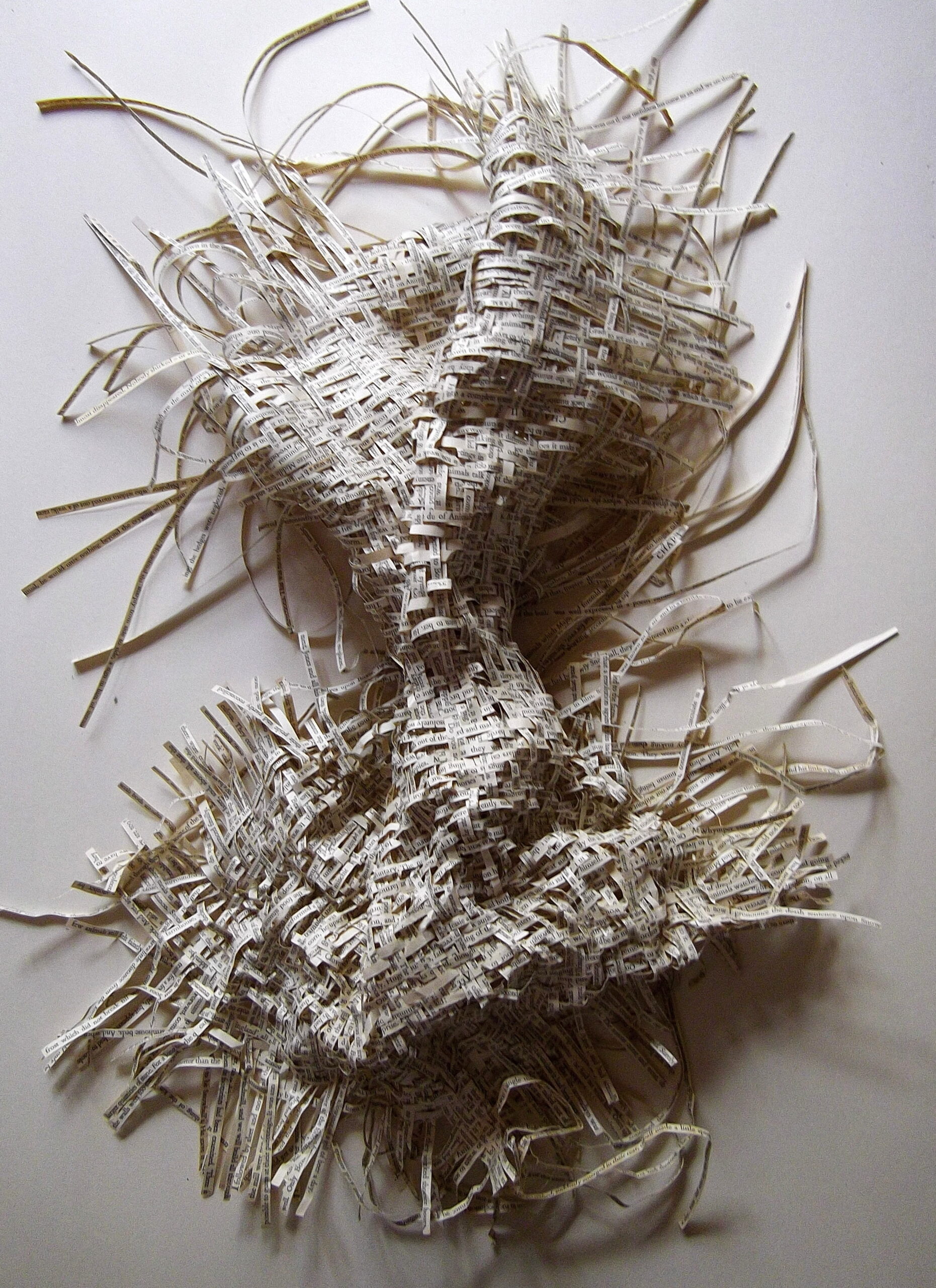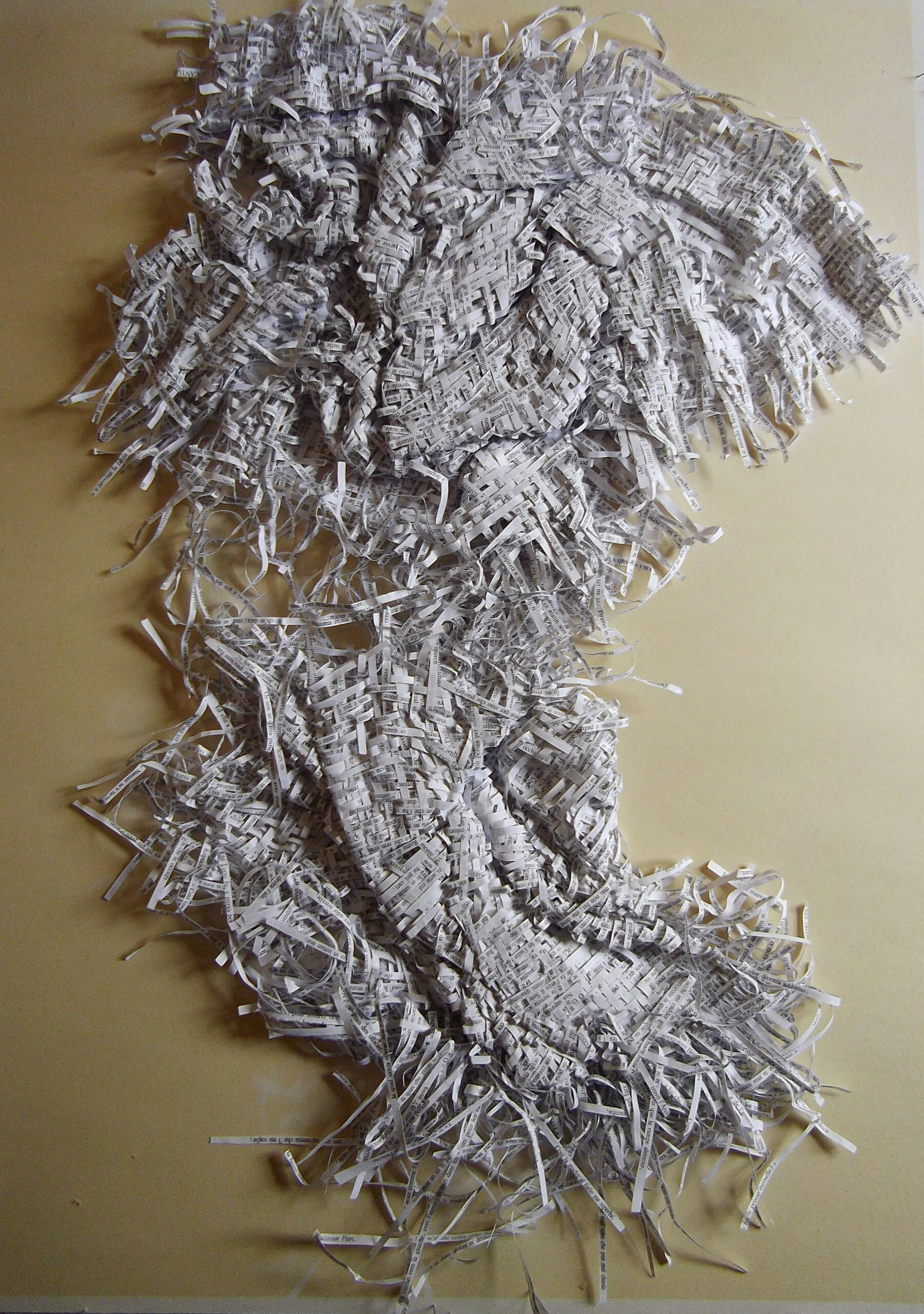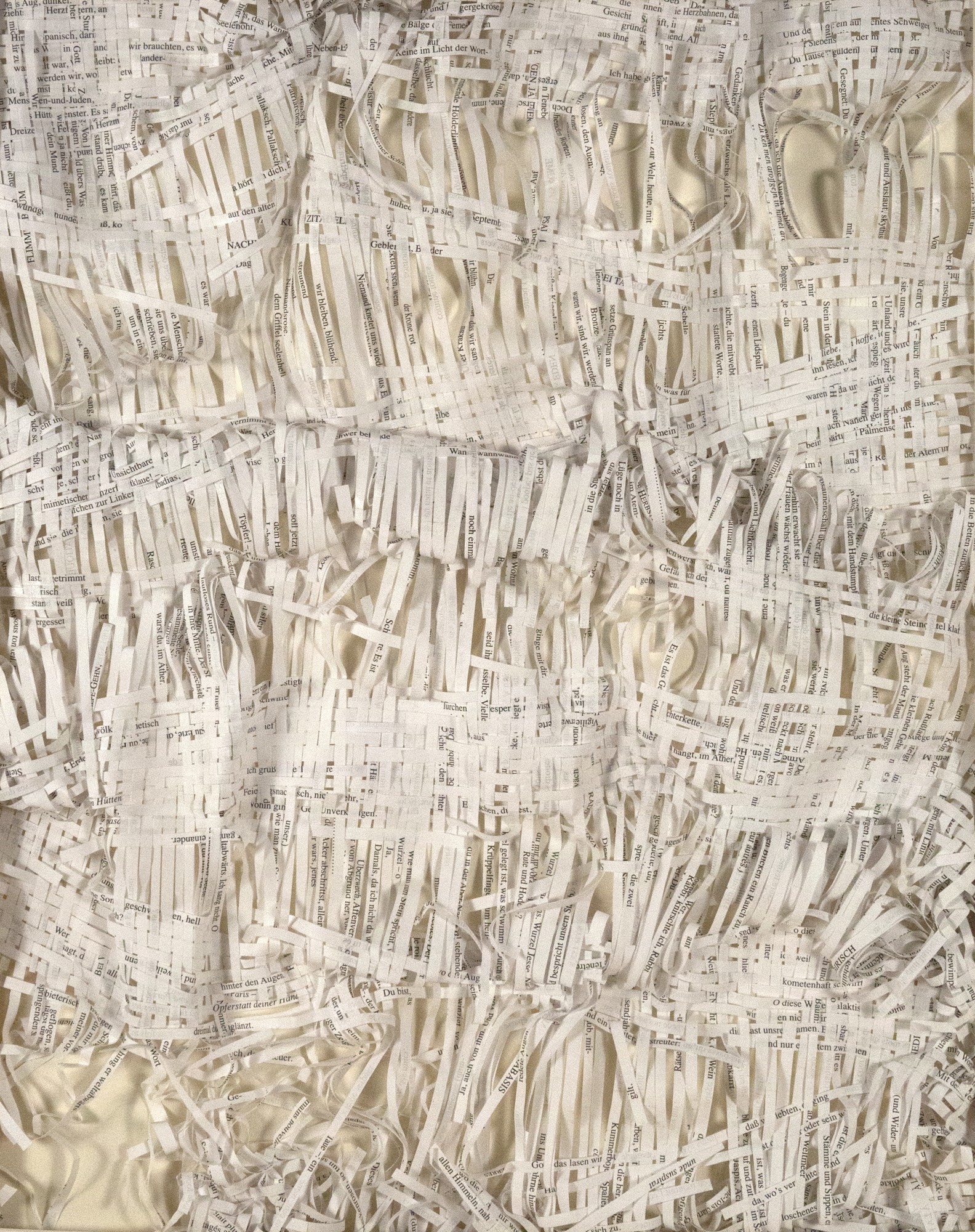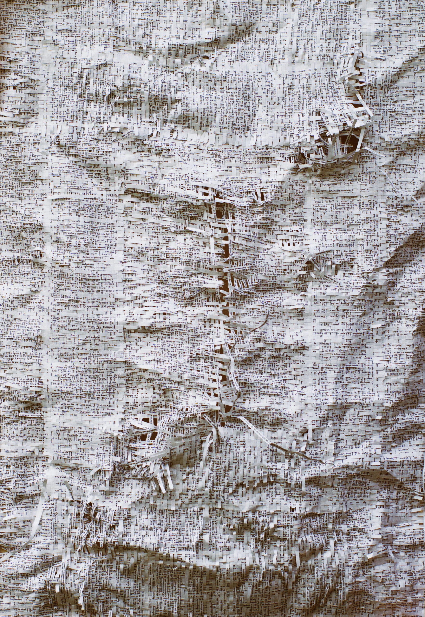 Textes littéraires tissés intégralement dans la langue d’origine. C’est la question de l’infini du livre, le paysage sans fin de la fiction. L’imaginaire est un territoire sans limites. Ce projet de monument de Babel » vise à donner une perception d’un océan de fictions. A l’image de La bibliothèque de Babel, une fois tissé ce sont des textes que l’on peut voir, que l’on peut sentir. Le livre donne une image. Il est traduit dans une langue qui n’est pas la sienne, celle de l’art visuel, de l’art textile. C’est un travail sans fin, un travail de Pénélope donnant corps aux livres. Il y a dans le processus de tissage la création d’un labyrinthe. Chaque livre est traduit en textile dans son intégralité, sa langue d’origine à la main. Depuis 2011, Ilann Vogt travaille à la métamorphose de la fiction, se perd dans les livres. A ce jour près de 400 textes furent tissés. Les livres font de ce projet une bibliothèque en perpétuelle augmentation.